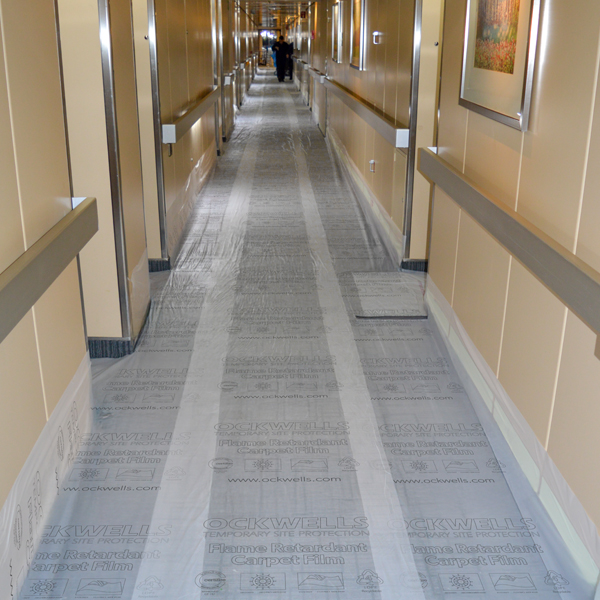 Developed to protect carpets during any new build, dry dock refit and on the run maintenance projects. manufactured from heavy duty flame retardant polythene film with a special low tack adhesive back, Flame Retardant Carpet Protection Film is certified to the UK Marine Equipment Regulations (Black Ensign) and EU Marine Equipment Directive (Wheelmark). Designed to protect carpets on floors, steps and stairs on a temporary basis without creating trip hazards, unlike the traditional method of using dust sheets. Ockwells Self Adhesive Flame Retardant Carpet Protection Film should only be used to protect carpet for up to 4 weeks. Because there are many variations in carpet fibres and installation methods, the user should test the suitability of the carpet protection film in an unexposed area.